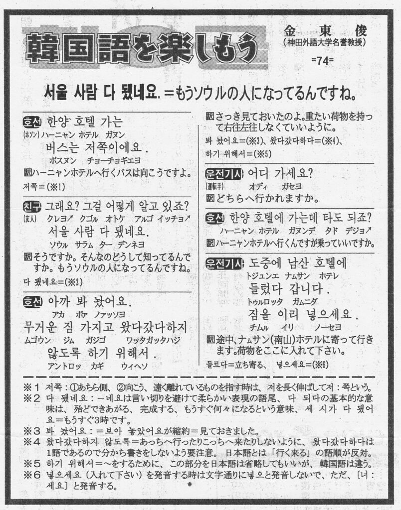 韓国語を楽しもう -74- おわり language X Facebook はてブ LINE Pinterest コピー 2026.01.25 2000年4月から2002年9月に金東順氏から提供していただいた資料「韓国語を楽しもう」は今回が最後になります。次回から「カナタラの次に」を途中からですが掲載していこうと思います。